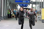 從片場(chǎng)照來看,“冬兵”塞巴斯蒂安·斯坦似乎在與“獵鷹”賽跑,兩人也有可能是正在逃離敵人的追捕。斯坦的左臂還戴了“機(jī)械手臂”,以便影片轉(zhuǎn)入后期制作特效。安東尼·麥凱依舊穿著“獵鷹”的經(jīng)典戰(zhàn)服,戴墨鏡顯得帥氣逼人。