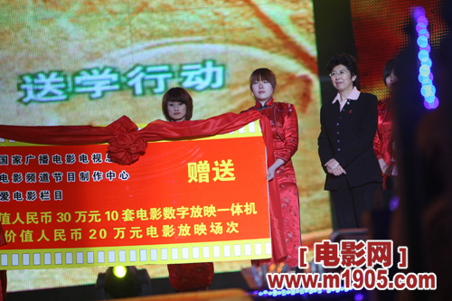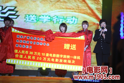 國(guó)家廣播電影電視總局、電影頻道節(jié)目制作中心、《愛電影》欄目更現(xiàn)場(chǎng)向老區(qū)人民贈(zèng)送價(jià)值人民幣30萬(wàn)元10套電影數(shù)字放映一體機(jī),以及價(jià)值人民幣20萬(wàn)元電影放映場(chǎng)次。電影頻道“送·學(xué)”行動(dòng),”以“送電影下鄉(xiāng)”、“學(xué)生活課堂”、“演慰問演出”三方面作為切入點(diǎn)和著力點(diǎn)。該活動(dòng)借送電影下鄉(xiāng)的機(jī)會(huì),深入生活、學(xué)習(xí)豐富的民族民間文化,該活動(dòng)也是為了深入學(xué)習(xí)貫徹科學(xué)法杖,加快發(fā)展農(nóng)村教育文化事業(yè),推動(dòng)文化創(chuàng)新的具體踐行。
