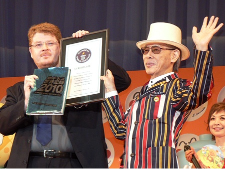 目前,《面包超人》第21部劇場版《面包超人:達旦旦和雙子星》正在日本熱映,因此在授獎儀式當(dāng)天,包括面包超人在內(nèi),該劇場版中的20個經(jīng)典卡通形象齊齊亮相舞臺。原著作者柳瀨嵩乘坐一輛高達6米的“達旦旦”花車走進了人們的視線,當(dāng)接過吉尼斯工作人員頒給的紀(jì)念證書時,柳瀨嵩興奮表示:“我愛吉尼斯!我愛面包超人!”激動心情難以平息。隨后,在面包超人的帶領(lǐng)下,所有聲優(yōu)演員向即將渡過90歲大壽的柳瀨嵩齊聲高呼:“祝柳瀨嵩先生90歲生日快樂!”為這位創(chuàng)作了無數(shù)經(jīng)典動漫形象的漫畫大師送上最真心的祝福。