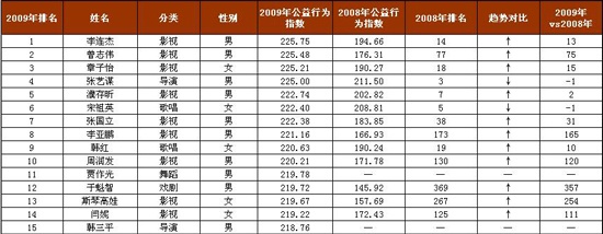 李連杰以指數(shù)225.75居500人榜首,比去年指數(shù)194.66、第14名大有提升,是公眾對他這些年“荒廢”演藝事業(yè)、大力投身慈善公益的認同,堪稱眾望所歸。2007年,以中國紅十字會“博愛大使”身份創(chuàng)立壹基金以來,李連杰頻繁現(xiàn)身,卻每次都是只談慈善不談電影,極有效地用自我影響力傳播了慈善觀念,關(guān)注“環(huán)保、教育、扶貧、健康、救災”五大公益領(lǐng)域的壹基金功績突出,其無形資產(chǎn)價值被德勤會計師事務(wù)所估算超過10億元人民幣;在剛結(jié)束的哥本哈根聯(lián)合國氣候大會上,李連杰更是騎自行車響應(yīng)環(huán)保號召,并用流利英語發(fā)表演講,身體力行地號召每個人從自己做起倡導低碳環(huán)保生活。