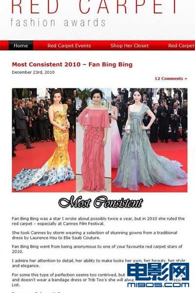 從該網(wǎng)站上不難看出,不少專業(yè)評審和世界各地的網(wǎng)友都對此次的評選結果表示贊同,范冰冰的龍袍造型也得到了相當多數(shù)人的支持和稱贊,Red Carpet 主編更是毫不吝嗇對范冰冰的喜愛,她評論道:“2010年她統(tǒng)治了紅地毯,特別是在戛納電影節(jié)上。”“我很欣賞她對細節(jié)的注意,她有能力使每套著裝真正成為她自己的,她的美麗,她的風格和優(yōu)雅。”文章后的網(wǎng)友評論亦不乏對范冰冰的溢美之詞,甚至有人回復稱:“中國女演員范冰冰是我心目中今年最佳紅毯之星。”看來,氣場日益強大且常變常新的“范爺”,毫無懸念地將繼續(xù)成為明年最受期待的時尚之星。