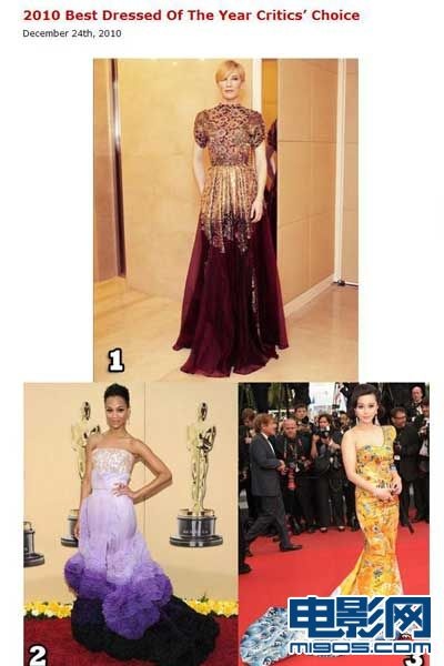 2010即將結束,國際知名時尚網(wǎng)站red carpet Fashion Awards將在這一年全球各大紅毯亮相的明星們的著裝進行綜合評比,選出年度十佳著裝。今年風光無限的國內(nèi)女星范冰冰憑借5月驚艷海內(nèi)外的著名“龍袍造型”分別獲得2010 Best Dressed Of The Year Critics’ Choice(專業(yè)評選)第三名,以及2010 Best Dressed Of The Year Readers’ Choice(網(wǎng)友評選)第六名,成為2010年度唯一上榜的華人明星。