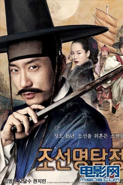 金明民扮演的朝鮮第一天才偵探,其銳利的眼神直接穿出海報與觀眾對視,稍稍上揚的嘴角既顯得這個偵探惡作劇感十足,也透露出了他在影片中的荒唐個性。而海報中的漢客主(韓智敏 飾)在影片中是掌握著殺人事件關(guān)鍵秘密的女人,她在海報中華麗的衣服和性感的表情與妝容,無一不透露出這個朝鮮時代的第一巨商的強烈氣場。而海報最右上方,正在奔跑的名偵探與狗販子(吳達秀 飾)喜感十足的姿勢和表情,透露出了影片中包含的喜劇感和冒險故事。