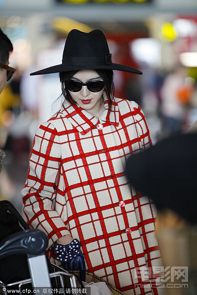 范冰冰穿格子斗篷黑超遮面赴巴黎 拿男包霸氣足