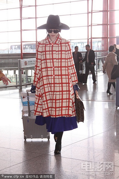 范冰冰穿格子斗篷黑超遮面赴巴黎 拿男包霸氣足