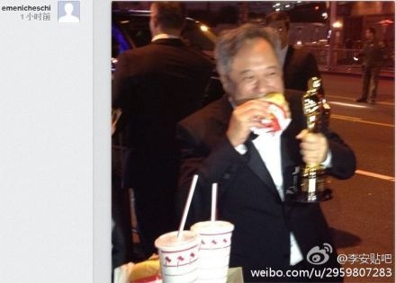 李安在街頭吃漢堡不忘緊緊握著小金人