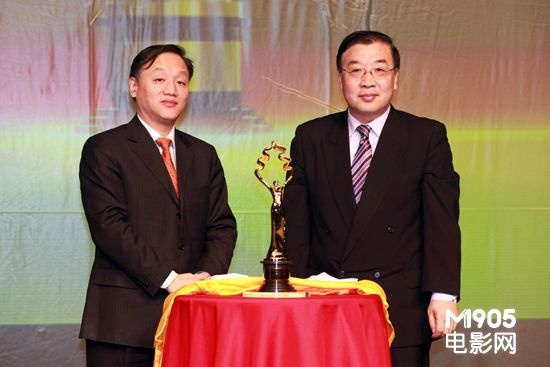 國家廣電總局電影局副巡視員欒國志(右)、北京市委宣傳部副部長張淼(左)揭幕天壇獎(jiǎng)獎(jiǎng)杯