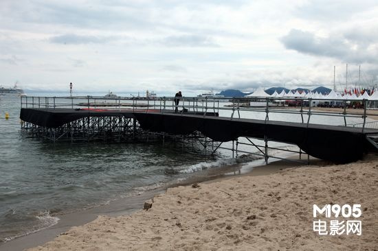 浮橋大約長(zhǎng)50米,向海面延展,桌椅都已經(jīng)擺放好,只等貴賓來(lái)臨。今年的舞臺(tái)也是從沙灘向海上鋪開,完全搭建在海面上。白色帳篷內(nèi)的高大花瓶、吧臺(tái)等設(shè)施都已經(jīng)準(zhǔn)備齊全,21日晚,這里將為電影人提供休息之所。