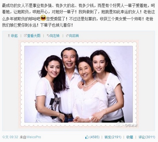 李冰冰今天在微博曬出一張全家福,照片中父母二人臉上雖然有了歲月的痕跡,但精神依然矍鑠。李冰冰說:“我們娘兒仨愛你到永遠!下輩子也候兒著你!”可見一家四口真是其樂融融,想必父母二人看見女兒的成就也可以安心的享渡天倫之樂的吧。