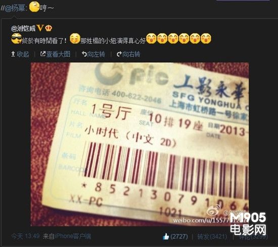 今天下午13時49分,劉愷威曬出《小時代》的票根,并附文字稱:“終于有時間看了!那姓楊的小妞演得真心好!”末尾還不忘加一連串親親的表情。而楊冪在15時11分轉(zhuǎn)發(fā)微博,只是評論一個“哼”的表情和一個文字“哼”。雖然只是寥寥數(shù)語卻流露出兩人濃濃的愛意。