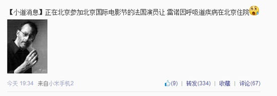 讓·雷諾近日攜新片《藍(lán)色風(fēng)暴預(yù)警》來(lái)中國(guó)參加北京國(guó)際電影節(jié)系列活動(dòng)。今晚(4月17日)微博傳出消息稱讓·雷諾因呼吸道疾病住院,而北京電影節(jié)主辦方也通知記者,所有讓·雷諾的專訪臨時(shí)取消。
