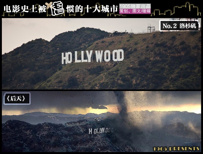 《后天》中巨型龍卷風(fēng)摧毀了洛杉磯城,山頂上的“好萊塢標(biāo)志”當(dāng)然也不能幸免?!痘罨鹑鄢恰分幸淮未蟮卣鹆盥迳即壍氐咨钐幍幕鹕絿姲l(fā),一時之間,處處充滿了地底爆發(fā)的巖漿。1974年的影片