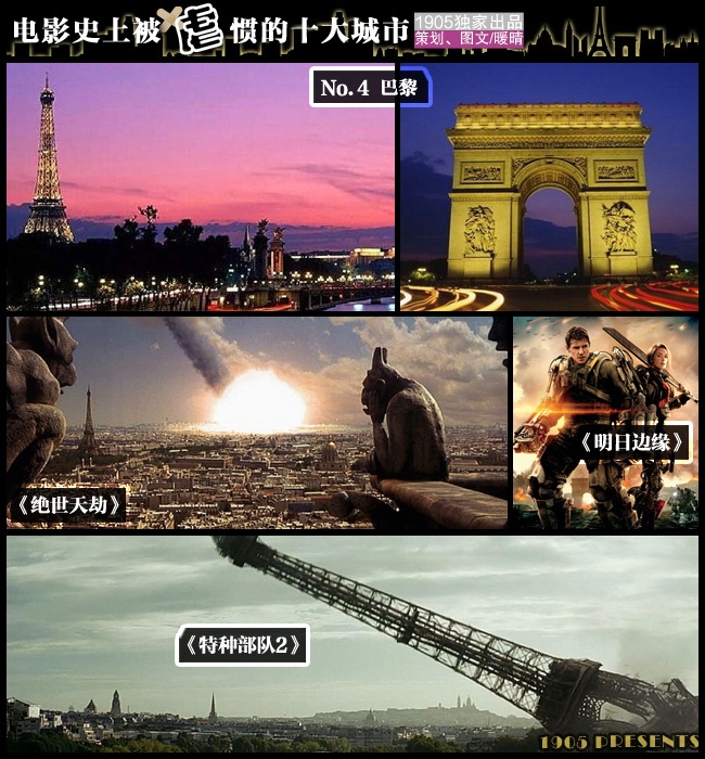 《28周后》中喪尸攻占了巴黎,病毒蔓延到整個歐洲?!短胤N部隊2:眼鏡蛇的崛起》中在“眼鏡蛇”的恐怖轟炸之下,埃菲爾鐵塔轟然倒塌?!督^世天劫》中隕石的來襲讓巴黎陷入火海,導演