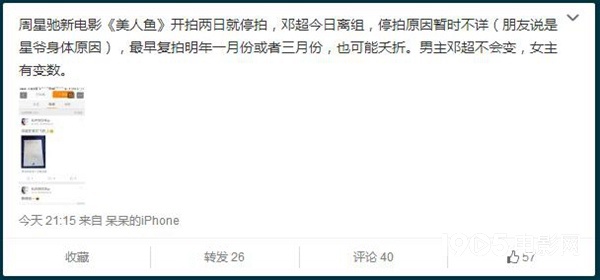 然而,在《美人魚》剛開拍的第二天,微博名為“王小呆”的網友爆料稱:“周星馳的新電影《美人魚》開拍兩天就夭折了,原因暫時還不知道。心疼鄧超,張雨綺!”該微博發(fā)布時間為23日20點52分。大約20分鐘之后,“王小呆”又發(fā)微博稱:“周星馳新電影《美人魚》開拍兩日就停拍,鄧超今日離組,停拍原因暫時不詳(朋友說是星爺身體原因),最早復拍明年一月份或者三月份,也可能夭折。男主鄧超不會變,女主有變數。”此言論隨即引起了不少影迷的恐慌。