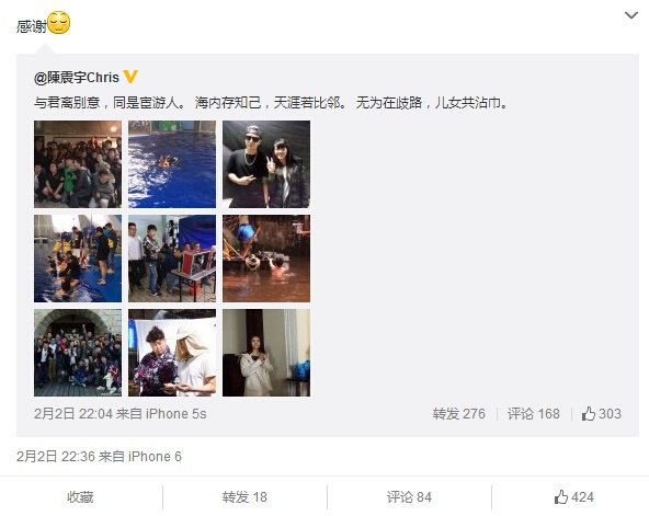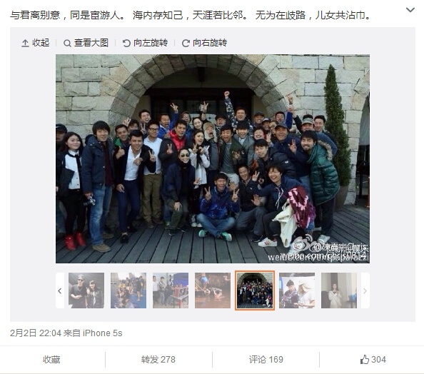 2月2日晚22時,周星馳公司項(xiàng)目及業(yè)務(wù)總監(jiān)“陳震宇Chris”更新微博曬出電影《美人魚》主演林允玉照以及全劇組大合影,并在微博上借用一段詩文:“與君離別意,同是宦游人。海內(nèi)存知己,天涯若比鄰。無為在歧路,兒女共沾巾。”宣告《美人魚》拍攝工作完美收官,同時表達(dá)對同事們同舟共濟(jì)這段時日的懷念與感動。林允隨后迅速轉(zhuǎn)發(fā)并表示感謝。