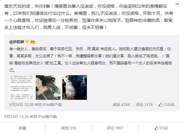 未料沒多久,伊能靜態(tài)度突變,轉(zhuǎn)發(fā)原文寫道:“喜歡天后的話,關(guān)你X事!情感里當(dāng)事人沒說話,你沒資格,你連堅(jiān)持22年的感情都沒有,22年我們知道彼此付出過什么。親情里,我兒子沒說話,你沒資格,懷胎十月、共有一個(gè)心跳是我,你沒舍得花一分錢養(yǎng)他,別演你多關(guān)心我孩子。別孬種的冷嘲熱諷,敢實(shí)名上法庭才爺兒們,我男人說,不找事,但決不怕事!”讓網(wǎng)友看得滿頭霧水,只能安慰伊能靜“認(rèn)真就輸了”。