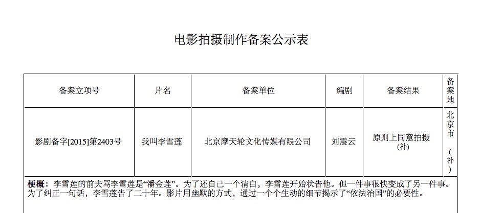 公示中,電影版《我不是潘金蓮》更名為《我叫李雪蓮》,而從披露的故事梗概來(lái)看,內(nèi)容也發(fā)生了一定程度的變化。雖然仍以女主角李雪蓮打官司為線索,但小說(shuō)中因?yàn)榧匐x婚生二胎而被丈夫污蔑水性楊花,從而踏上上訪之路的橋段似乎有所刪改,而是將通過(guò)幽默的方式和一個(gè)個(gè)生動(dòng)的細(xì)節(jié)來(lái)揭示“依法治國(guó)”的必要性。