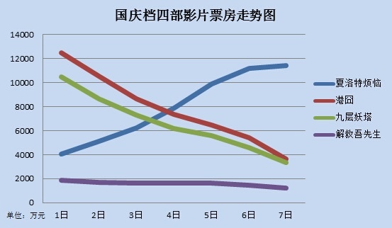 1905電影網(wǎng)訊 今年國慶檔,內(nèi)地票房約為18.5億,比去年同期增長了接近七成,十一當(dāng)日的票房超過3億,創(chuàng)出歷史新高。《夏洛特?zé)馈?/a>以黑馬之姿成功“攪局”,國慶檔內(nèi)的票房超過5.58億,排在第一。而比它早上映一周的《港囧》則以5.46億的成績位居第二,《九層妖塔》4.64億排第三。