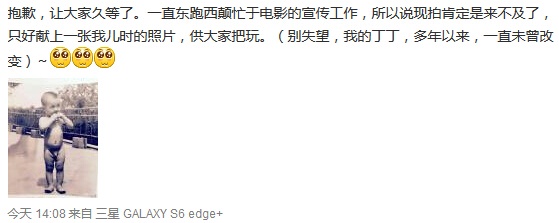 10月15日下午14點(diǎn)左右,沈騰在微博上發(fā)文:“抱歉,讓大家久等了。一直東跑西顛忙于電影的宣傳工作,所以說現(xiàn)拍肯定是來不及了,只好獻(xiàn)上一張我兒時(shí)的照片,供大家把玩。(別失望,我的丁丁,多年以來,一直未曾改變。)”同時(shí)發(fā)布了一張自己兒時(shí)的裸照,十分可愛。也令不少影迷紛紛點(diǎn)贊,夸獎(jiǎng)他兌現(xiàn)諾言,為影片助力。