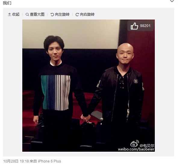 10月28日晚,包貝爾在微博曬照,他和鹿晗十指緊扣,面向鏡頭微笑。并配文“我們”,模仿范冰冰與李晨在公布戀情時(shí)稱我們。