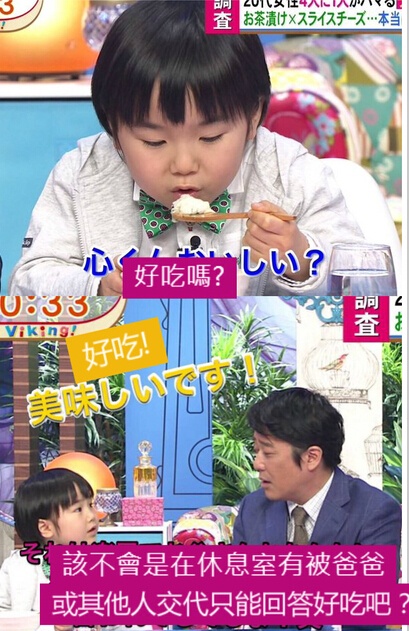 節(jié)目播出當(dāng)天,觀眾提議起司茶泡飯由主持人和來賓試吃,寺田心也隨大人們一起品嘗,被問好吃嗎?他十分有禮貌地回應(yīng):“好吃!”一旁的主持人坂上忍或許是想和他開玩笑:“你該不會(huì)是在休息室有被爸爸或誰交代說只可以回答好吃吧?”寺田心毫不猶豫地回他說:“我沒有爸爸!”讓坂上忍尷尬地只能摸摸他的頭結(jié)束話題。