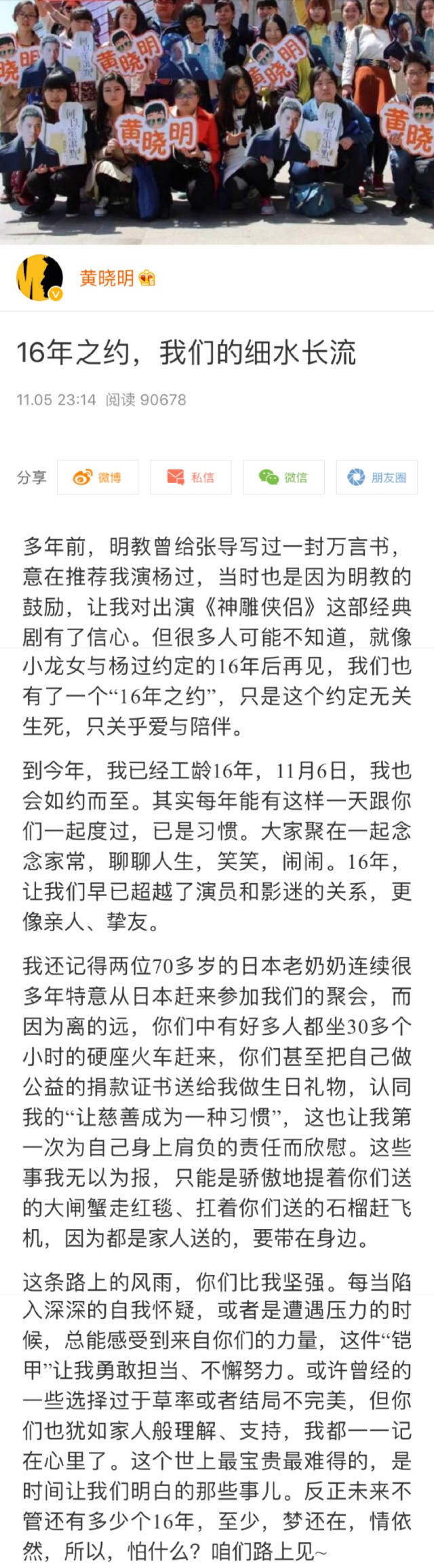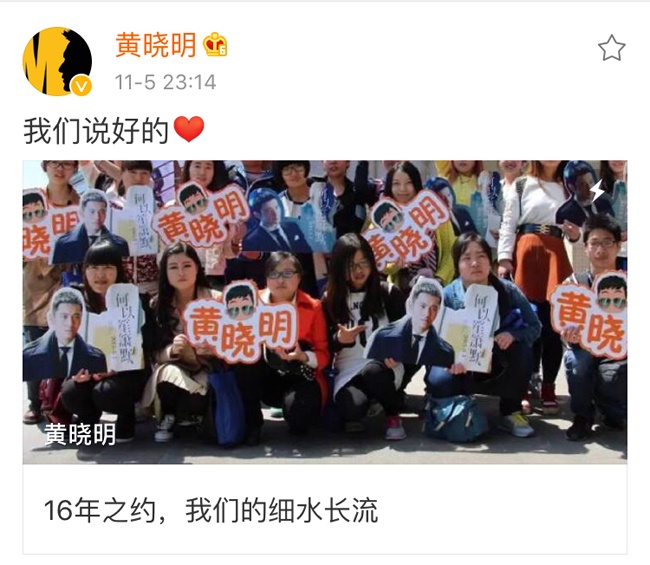1905電影網(wǎng)訊 生日前夕,黃曉明深夜感慨“16年之約,我們的細(xì)水長流…”并附上長微博講述了自己與粉絲16年的家人情誼,表達(dá)了對(duì)粉絲一路支持的感恩心情,不是一般的用心!