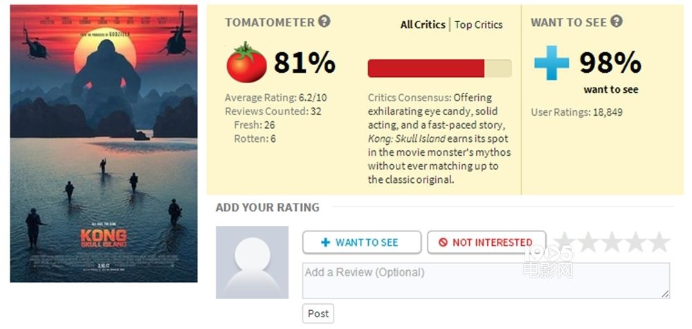 共9張1905電影網(wǎng)訊 由華納兄弟影業(yè)、傳奇影業(yè)、騰訊影業(yè)出品的好萊塢動作冒險巨制《金剛:骷髏島》近日爆出首批主流媒體評價,北美知名電影評分網(wǎng)站爛番茄上32家權(quán)威媒體外媒打出了81%新鮮度(好評),這一分?jǐn)?shù)在同類大片中實屬不易。好評主要集中在震撼的視覺特效、驚險刺激的冒險劇情和金剛本次“大有不同”的角色形象,權(quán)威媒體《Variety》更盛贊其比2015年全球票房第一的《侏羅紀(jì)世界》好十倍!外媒稱景甜在片中戲份不多,但是個奇特的存在。