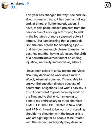 蒂莫西·柴勒梅德在文中還說,介于合同原因,他無法回答關(guān)于伍迪·艾倫新電影的任何問題。然而,雖然不能談?wù)摗都~約的一個雨天》,但他仍決定采取行動勝于言說,“我不想從這部中電影獲利,為此,我要把我的全部工資捐給三家慈善機(jī)構(gòu)。”