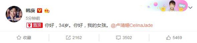 1905電影網(wǎng)訊 今天下午,韓庚發(fā)微博疑似公開和《戰(zhàn)狼2》女主角盧靖姍的戀情,他寫道:“你好,34歲。你好,我的女孩。”并將該微博置頂。