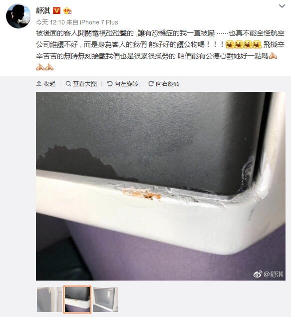 在這條微博中舒淇還配上三張圖片,展示了飛機上電視被破壞的情況,這些公共設(shè)施螺絲釘松動、掉漆嚴(yán)重,舒淇呼吁“飛機辛辛苦苦的無時無刻接載我們很累很辛勞,咱們要有公德心對她好一點。”