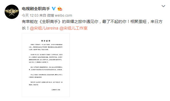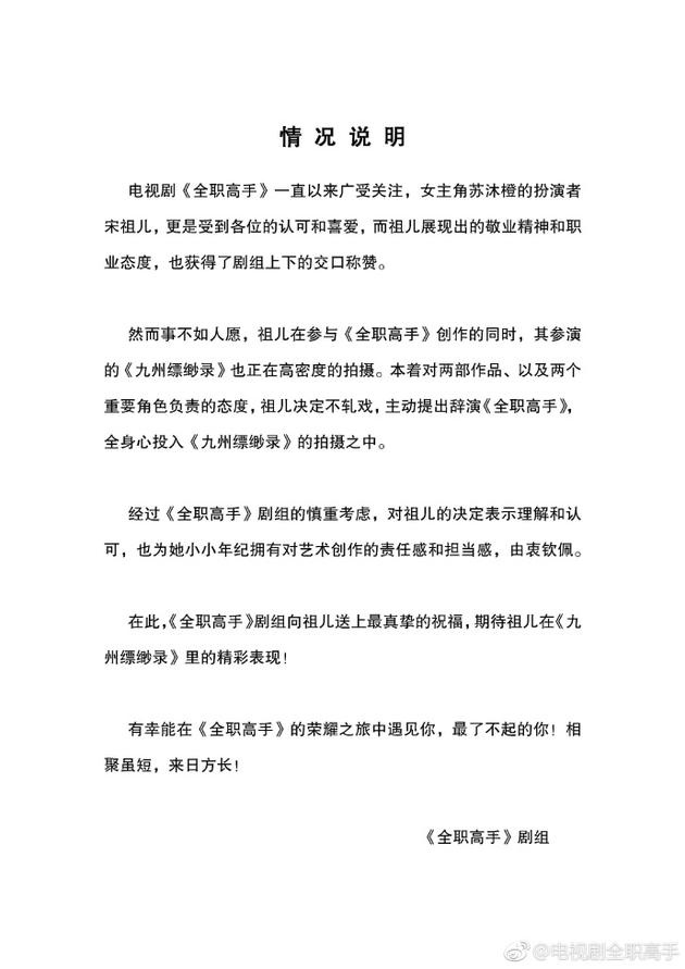 1905電影網(wǎng)訊 日前,電視劇《全職高手》官方微博聲明,宣布女主角宋祖兒辭演蘇沐橙一角。聲明稱,宋祖兒的新劇《九州縹緲錄》正在拍攝中,恰與《全職高手》的創(chuàng)作時間相撞。本著對兩部作品、兩個角色負(fù)責(zé)的態(tài)度,宋祖兒主動辭演《全職高手》。對此,《全職高手》官方表示理解和認(rèn)可。