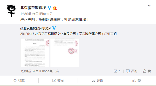 1905電影網(wǎng)訊 4月17日,北京稻草熊影視文化有限公司(吳奇隆所屬公司)就部分網(wǎng)絡用戶長時間、持續(xù)性地發(fā)布針對吳奇隆的侮辱性言論、涉嫌嚴重侵犯吳奇隆名譽權(quán)一事,發(fā)布律師聲明:有關(guān)“吳奇隆集資詐騙”“吳奇隆公司無法支付演員片酬”等內(nèi)容均系造謠,對于吳奇隆“不育、斷子絕孫”等言論均屬誹謗,要求網(wǎng)絡用戶及網(wǎng)絡營銷號即刻刪除與上述言論有關(guān)的不實信息,對于違規(guī)用戶將依法追責,絕不姑息。