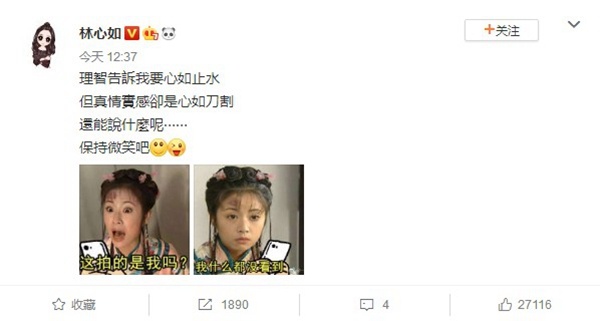 1905電影網(wǎng)訊 6月20日中午,林心如發(fā)微博稱“理智告訴我要心如止水,但真情實(shí)感確實(shí)心如刀割,還能說(shuō)什么呢……保持微笑吧”。同時(shí),還配上了兩張《還珠格格》中紫薇的表情包,一張的配文是“這拍的是我嗎?”,另一張則是“我什么都沒看到”,疑似回應(yīng)視覺中國(guó)拍丑圖一事。