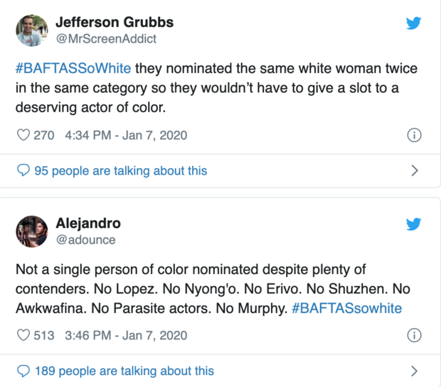 2018年,一份報(bào)告顯示,英國學(xué)院獎(jiǎng)歷史上所有提名者中,94%是白人。商業(yè)心理學(xué)公司Pearn Kandola的分析報(bào)告還顯示,獲得最佳男配角和最佳女配角提名的人中有92%是白人。