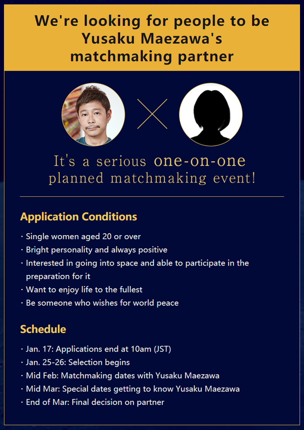 征集女友的要求如下:20歲以上(前澤友作自己44歲),性格開朗,對(duì)太空感興趣,熱愛和平。
