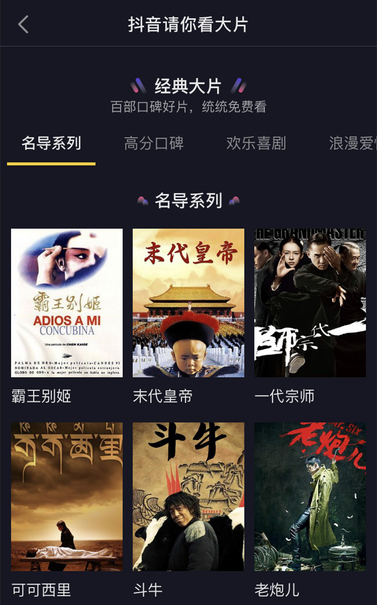 B站購(gòu)買老電影的動(dòng)作確實(shí)越來(lái)越快了。在此之前,B站雖然也一直在購(gòu)買老電影,但除動(dòng)畫(huà)電影外,知名度較高的影片卻相對(duì)較少。而從今年開(kāi)始,“嗶哩嗶哩電影”則以每日2-3部的頻率上傳著經(jīng)典電影,并且每次都伴隨著B(niǎo)站用戶“小破站牛逼”的夸贊。?在毒眸看來(lái),B站選擇不斷購(gòu)入老電影,一方面是為了鞏固已有的社區(qū)文化(點(diǎn)此閱讀:濃眉大眼的B站也出年度影視榜單了),培養(yǎng)核心用戶在B站看電影、看電影解說(shuō)Up主視頻的生態(tài)閉環(huán);另一方面,隨著非ACG向的新用戶的增多,B站需要更多的優(yōu)質(zhì)內(nèi)容留住他們,便宜優(yōu)質(zhì)的老電影無(wú)疑是一個(gè)物美價(jià)廉的選擇——對(duì)于各大視頻網(wǎng)站付費(fèi)會(huì)員來(lái)說(shuō),電影一直是留存用戶的重要內(nèi)容。?和B站節(jié)奏略有不同的是,抖音則是繼《囧媽》《大贏家》之后,近日一口氣上線了近百部電影。用戶在抖音App中搜索“電影”,即可進(jìn)入“抖音請(qǐng)你免費(fèi)看大片”的頁(yè)面。該頁(yè)面中有名導(dǎo)系列、高分口碑、歡樂(lè)喜劇、浪漫愛(ài)情、高能動(dòng)作、經(jīng)典劇情這六種電影分類,一些知名的劇情片、喜劇片、愛(ài)情片均在列,如《霸王別姬》《戰(zhàn)狼》《夏洛特?zé)馈贰镀咴屡c安生》等。