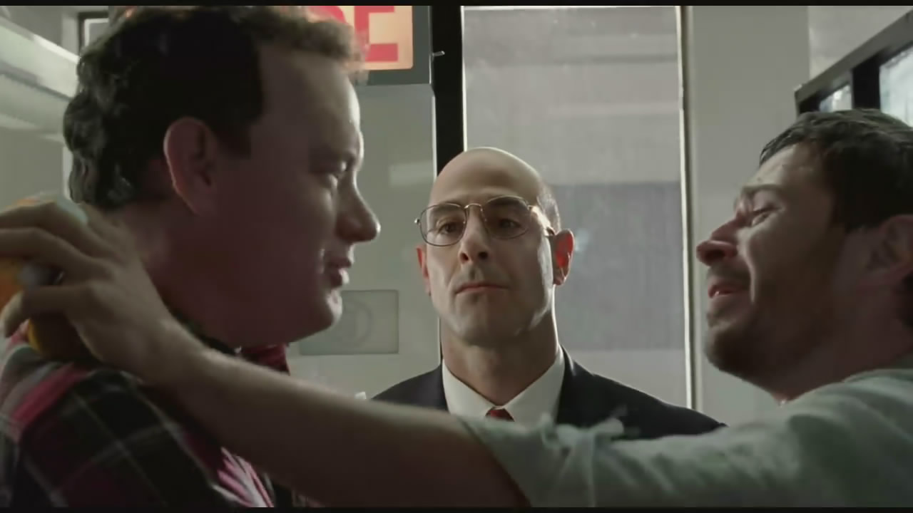 他成了機(jī)場里的英雄,世界上總有很多小人,他們內(nèi)心陰暗,看不得別人好,總是想方設(shè)法搞別人。有些小人甚至能得到很大的權(quán)力。比如這個光頭,已經(jīng)是機(jī)場管理員了,平時裝得一副大公無私恪守職責(zé)的樣子,但其實他心底里是憎恨男主老湯的。他有權(quán),但沒有老湯的勇氣。老湯被困在機(jī)場,卻始終想用各種方式闖出去,他也被困在機(jī)場,做為一個頭頭,卻永遠(yuǎn)沒法像機(jī)場里的旅客一樣自由自在。所以,他對老湯說,只要我在這個位子上,你就永遠(yuǎn)不可能踏進(jìn)美國的領(lǐng)土。老湯望著光頭,沒有生氣,因為他知道自己不會放棄,而光頭是個很容易放棄的人。老湯回去跟那個印度清潔工聊天,說起了被困在機(jī)場。印度人說,其實誰又不是被困在機(jī)場了?23年前,我在印度開過一個小煙店,有天一個警察說我欠稅,我就交了。第二天他又來了,我又給了錢。第三天,第四天,我每天都給,直到第五天,我拿起一把刀扎進(jìn)了他的胸膛。從此我就逃到了美國,每個人都在某種程度上被困在自己的局里。即使他們看起來很自由,但那顆心卻被束縛的死死的。老湯繼續(xù)申請出境,也被每天拒絕著。直到有一天,他被朋友們叫醒。他們說,你的國家的戰(zhàn)爭結(jié)束了,在機(jī)場酒吧里,人人都為老湯慶祝,而美女空姐也為他弄到了一個一日緊急簽證。老湯可以進(jìn)入美國領(lǐng)土了,老湯拿著緊急簽證去找光頭要他簽字,但光頭說你可以坐飛機(jī)回國,但我說過的不準(zhǔn)你入境。老湯堅持要入境。光頭于是拿著老湯朋友的把柄來要挾他。我可以給你簽名,但你的朋友們都要被開除,包括那個印度清潔工,我要把他遣返印度。于是老湯說,我不入境了。我馬上回國。登機(jī)前,他所有的朋友都來勸他了,他沒說話,然后他跟印度朋友道別。