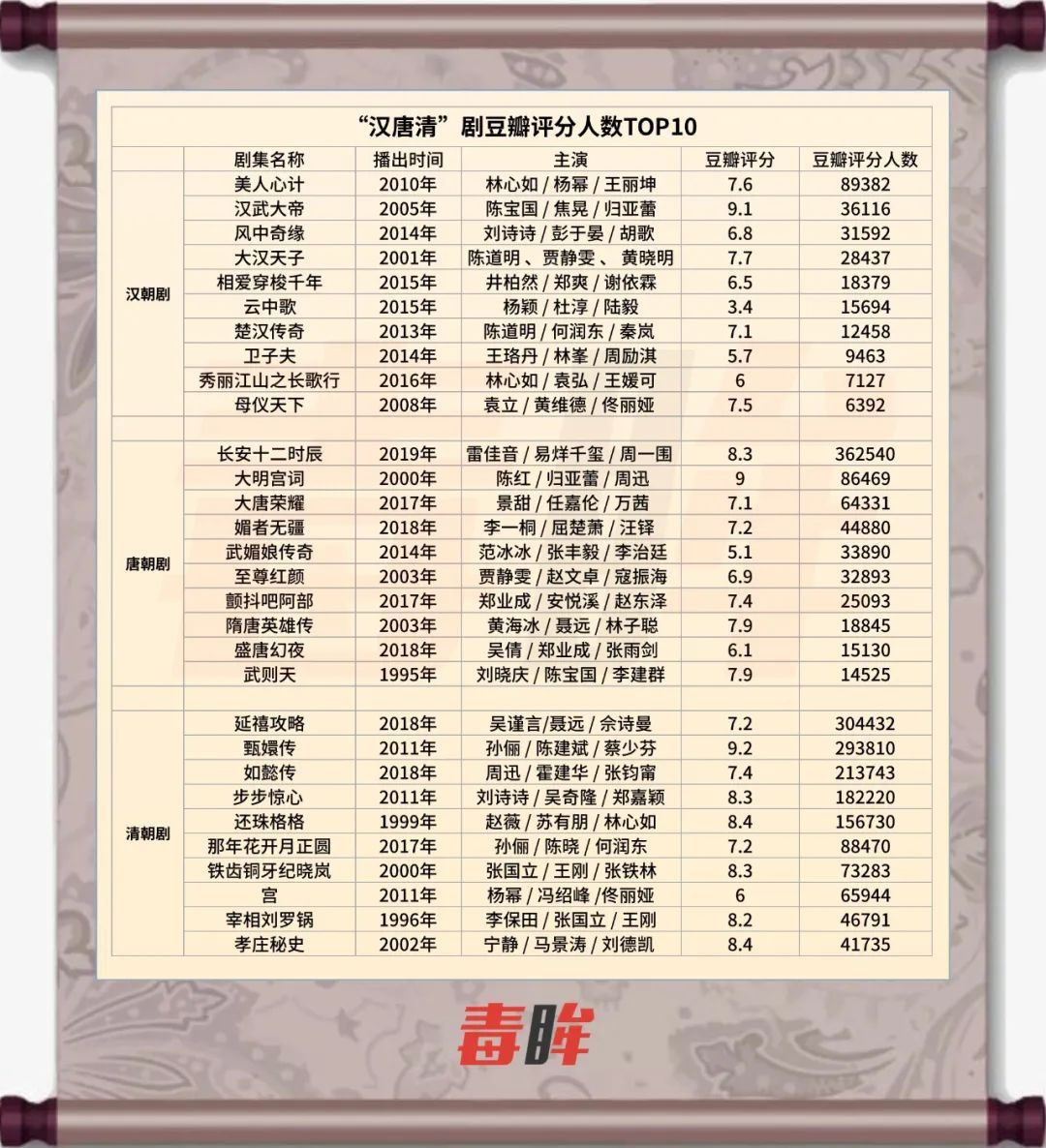 ??從各類朝代劇豆瓣評分人數(shù)TOP10來看,A班的朝代劇漢、唐、清,是唯三入榜評分人數(shù)不低于6000,且在正劇、“戲說”劇、“IP流量”劇都齊全了的朝代劇,可謂是準確踩在了電視劇行業(yè)重要的發(fā)展節(jié)點,是當(dāng)之無愧的“頂流”。