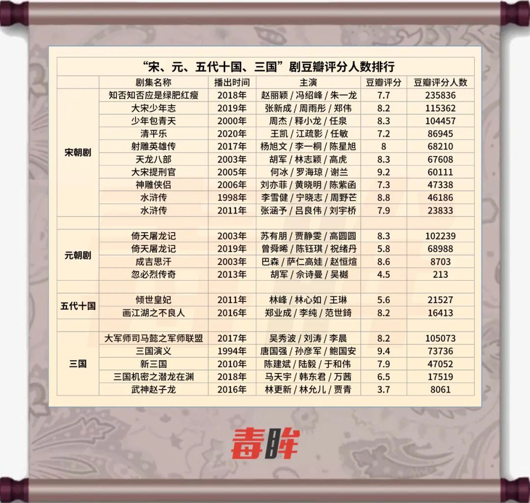 ??從榜單不難看出,宋朝劇的“面孔模糊”,或許在于其極少以帝王為主角,而是以民間故事及武俠傳奇為主。金庸的《天龍八部》《射雕英雄傳》《神雕俠侶》也都發(fā)生在宋朝,但也少有人關(guān)注郭靖守了多年的城,究竟是在哪位皇帝的治下。而榜單中的《少年包青天》《水滸傳》《楊門女將》也取材自民間小說。排名第一的《知否知否應(yīng)是綠肥紅瘦》則是改編自“種田文”的“宅斗”故事,也是發(fā)生于宋朝民間大家族的故事。
