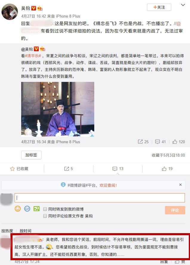 ??此外,不拍帝王故事還有一個原因:涉及到多民族的戰(zhàn)爭問題,不好處理。吳鉤曾發(fā)微博表示宋夏之間的戰(zhàn)爭是“本來可以拍得很精彩的戲”,不過下方有知情人士做出了解答——