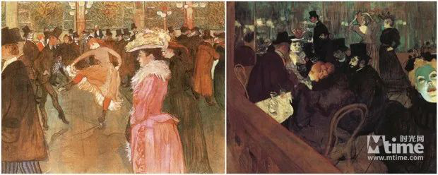 亨利·德·圖盧茲·羅特列克畫筆下的紅磨坊比雷諾阿的擁有更高的飽和度,更加熱鬧絢麗也更加黑暗詭異,貴族婦女、紳士、酒鬼和舞女聚集在這個(gè)神奇的地方