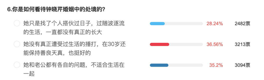 對于鐘曉芹在婚姻中的處境,網(wǎng)友想法不一。36.56%的人認為鐘曉芹“沒有真正遭受過生活的捶打,在30歲還能保持善良天真,也挺好的?!?/p>