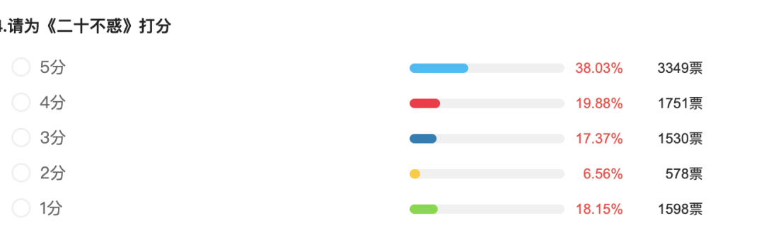 相比于《三十而已》,另一部女性群像劇《二十不惑》稍顯遜色,在Feng向標調(diào)查中取得7.1的評分。只有38%的觀眾給出了5分好評。
