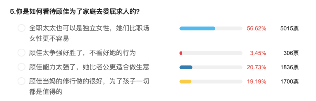 對于顧佳為了家庭去委屈求人的一系列做法,56.62%的網(wǎng)友給予理解,表示“全職太太也可以是獨立女性,她們比職場女性更不容易。”