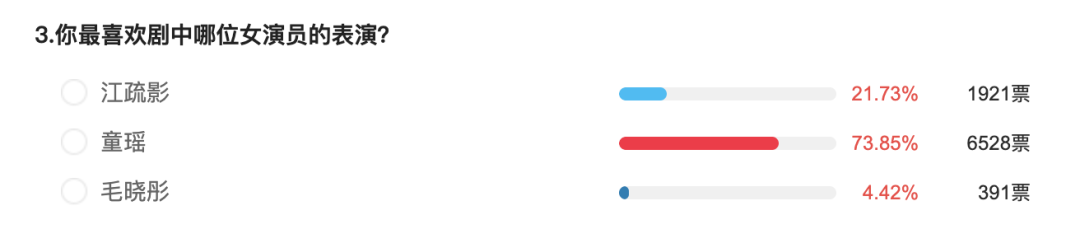 童瑤對這一角色的詮釋也得到了大多數(shù)觀眾的認可。調(diào)查顯示,有73.85%的觀眾最喜歡童瑤的表演。