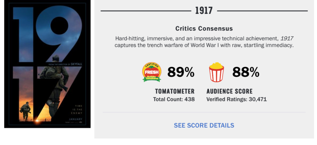 爛番茄的新鮮度89%,觀眾爆米花度88%。叫好又叫座。