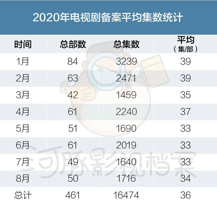 重“質(zhì)”而非“量”,還體現(xiàn)在備案電視劇平均集數(shù)的減少上。2019年全年備案電視劇平均集數(shù)為38集/部,而到了今年8月,平均集數(shù)已經(jīng)降至34集/部??梢悦黠@觀察到,自2月以后電視劇備案平均集數(shù)的下降。