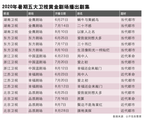 縱覽五大衛(wèi)視黃金劇場(chǎng)暑期片單,著眼現(xiàn)實(shí)的當(dāng)代都市劇仍是最大主角。湖南衛(wèi)視金鷹劇場(chǎng)暑期青春定位鮮明,三部新劇《蝸牛與黃鸝鳥》《二十不惑》《以家人之名》均以新生代演員演繹青春成長(zhǎng)、浪漫愛(ài)情;其中《以家人之名》收視熱度高漲,登頂暑期劇直播關(guān)注度榜單。東方衛(wèi)視東方劇場(chǎng)同樣推出三部都市劇《愛(ài)我就別想太多》《三十而已》《生活像陽(yáng)光一樣》,劇集定位更加偏向成熟、家庭人群;聚焦都市女性的《三十而已》話題性十足,霸榜熱搜。浙江、江蘇衛(wèi)視以年代劇搭配都市情感劇,推出《局中人》《愛(ài)之初》《幸福還會(huì)來(lái)敲門》。北京衛(wèi)視品質(zhì)劇場(chǎng)以年代劇為主打,2019年北京衛(wèi)視啟動(dòng)獨(dú)播計(jì)劃,今年暑期推出的兩部近代都市劇《鬢邊不是海棠紅》《旗袍美探》獨(dú)具特色,豐富暑期觀劇選擇。
