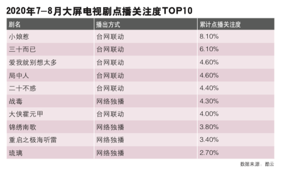 從大屏、移動(dòng)端點(diǎn)播熱度來(lái)看,暑期多屏頭部?jī)?nèi)容重合度頗高,《三十而已》《小娘惹》《二十不惑》《大俠霍元甲》《局中人》《愛(ài)我就別想太多》等臺(tái)網(wǎng)聯(lián)動(dòng)劇熱度居高。從《花千骨》到《長(zhǎng)安十二時(shí)辰》《陳情令》,古裝題材往往是暑期檔爆款聚集地,2020年熱劇點(diǎn)播排行更具現(xiàn)實(shí)主義色彩,都市劇、懸疑劇搶占高地,古裝劇稍顯暗淡。