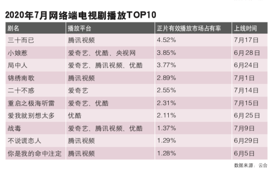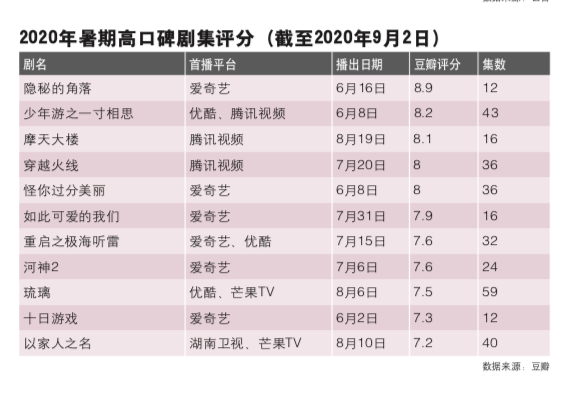 隨著國(guó)產(chǎn)劇提質(zhì)減量進(jìn)程加速,市場(chǎng)亂象得以規(guī)制,觀眾切實(shí)感受到“國(guó)產(chǎn)劇越來(lái)越好看”?;仡櫴钇跈n熱播劇口碑表現(xiàn),7分以上佳作超過(guò)10部,題材呈現(xiàn)多元化。懸疑劇《隱秘的角落》《摩天大樓》,都市情感劇《怪你過(guò)分美麗》,青春劇《如此可愛(ài)的我們》,古裝劇《少年游之一寸相思》《琉璃》均獲得高口碑。曾經(jīng)備受爭(zhēng)議的“流量明星+IP”模式網(wǎng)絡(luò)劇,也隨著《穿越火線》播出,收獲“意外地好看”“真香”等評(píng)論。2019年市場(chǎng)就曾出現(xiàn)“最高品質(zhì)”暑期檔的評(píng)價(jià),相比之下,2020年高分劇數(shù)量再度增加,更多圈層化、小而美作品活躍熒屏。